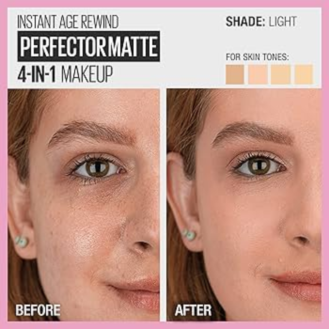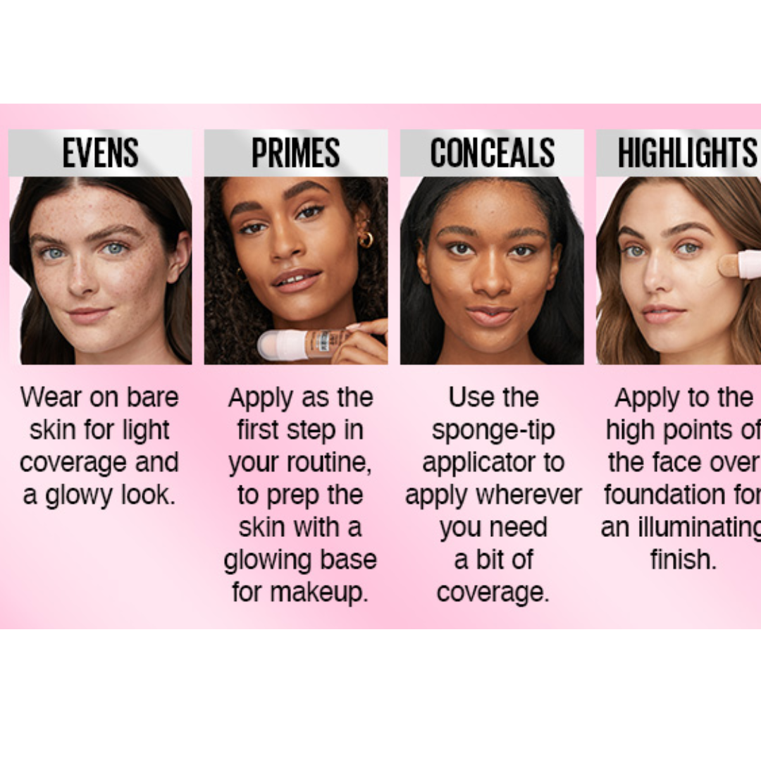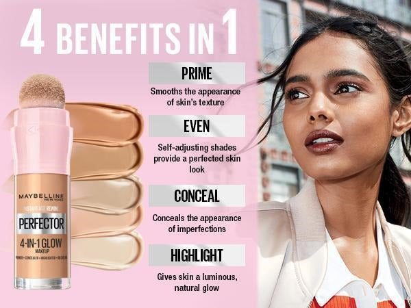 Transform your makeup routine with Maybelline's Instant Rewind 4-in-1 Glow Perfector, your all-in-one solution for flawless, luminous skin in seconds. This revolutionary formula combines the benefits of: